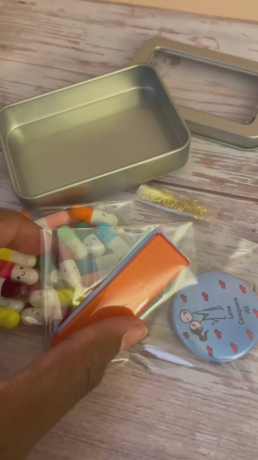 Our super cute Love Note Kit is the perfect mini gift to show that special someone how much they mean to you. The kits comes with 25 smiling capsules, 25 sheets of paper, 25 paper rings and a Love Conquers All” pin.